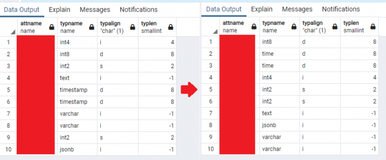 因此我們必須知道哪些是屬於可變長的型態與型態所需要的對齊方式。此link提供了一個SQL,讓你可以列出所有type的typalign與typlen。其中typalign用於決定所需要的對齊方式;typlen為-1則代表為可變長的型態: